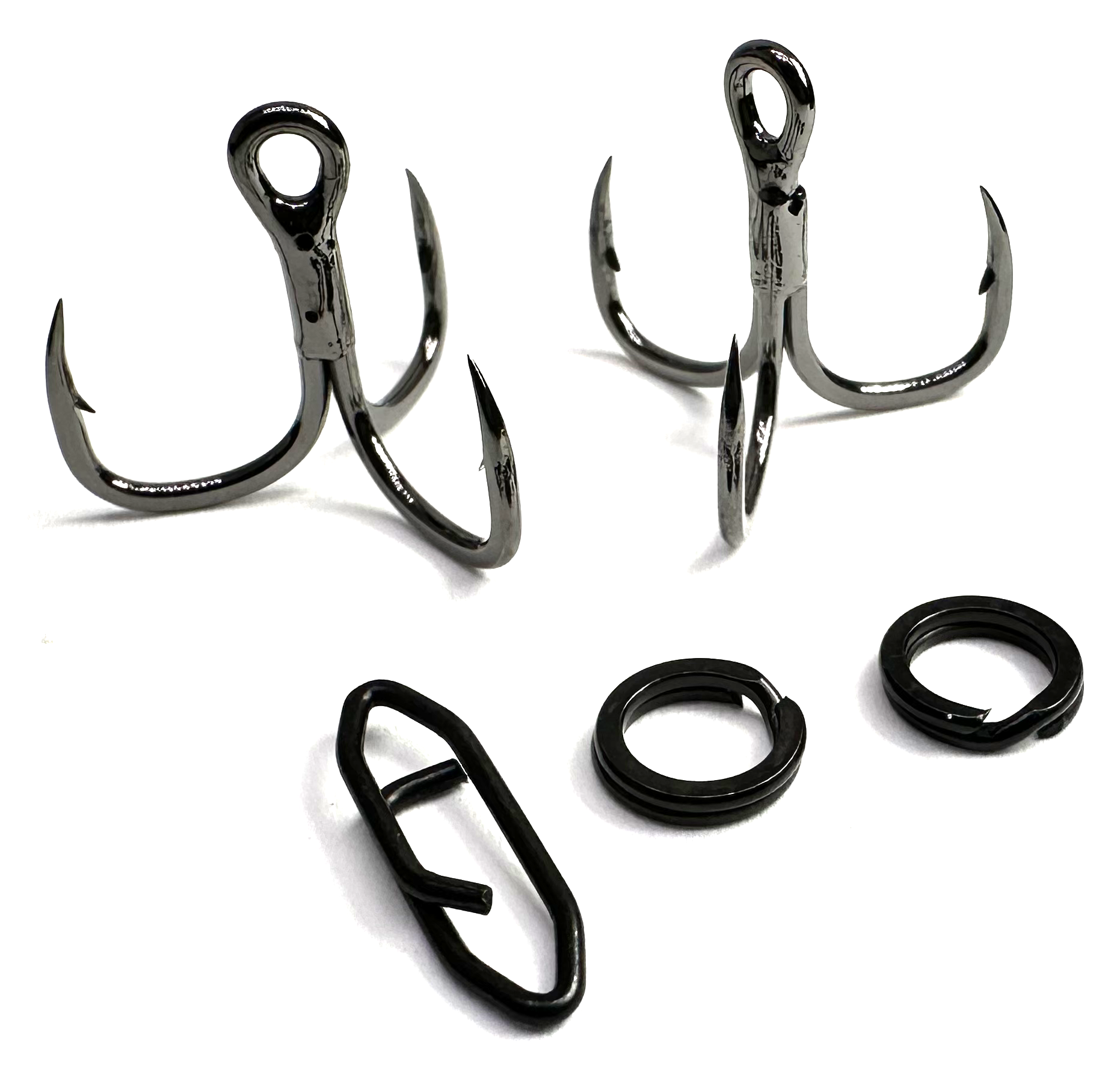 Each set is accompanied by a black snap clip for quick and easy lure changes. No more fumbling with knots or struggling to switch out your lures. These clips are not only efficient but also durable, ensuring a secure connection between your bait and hook. Whether you're targeting bass, pike, or walleye, these black hardware sets are stealthy and are your secret weapon for a successful day on the water. Upgrade your tackle box with this versatile set and get ready to reel in your dream catch.